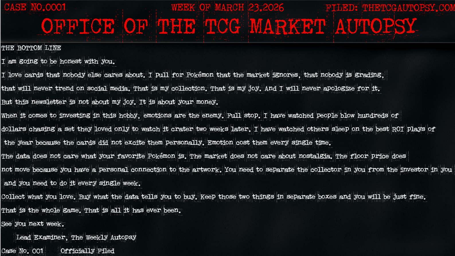 Every Sunday I break down the biggest winners and the most brutal losers in the Pokémon TCG market. The cards that moved. The sets that are dying. The manipulation tactics being deployed right now. The data behind the prices before the rest of the community catches on.